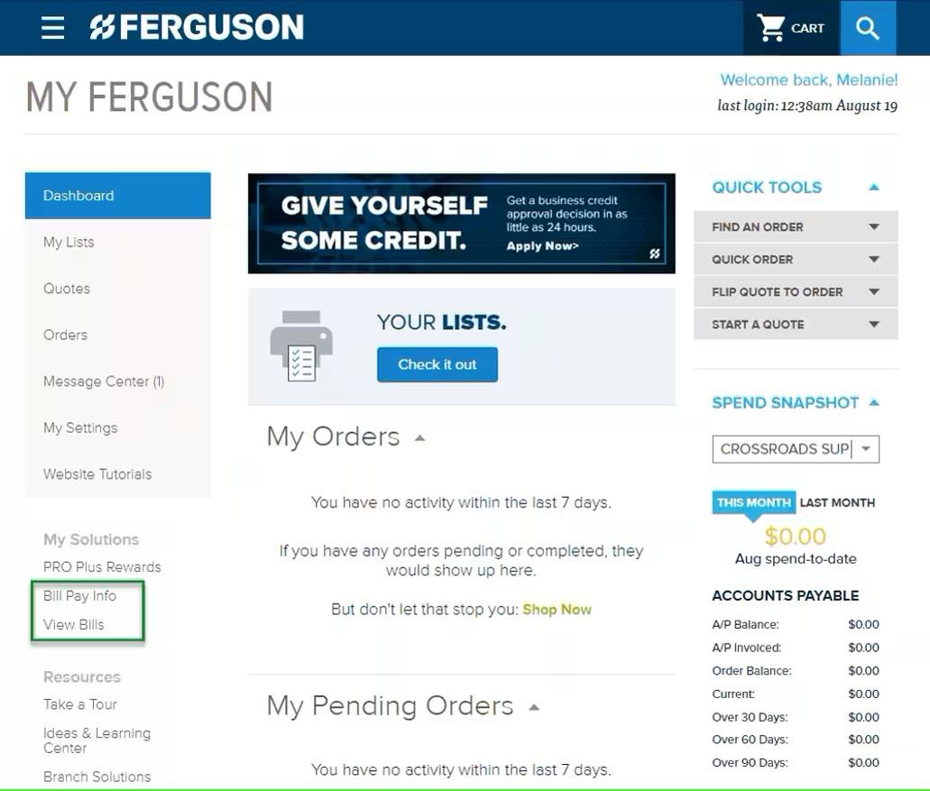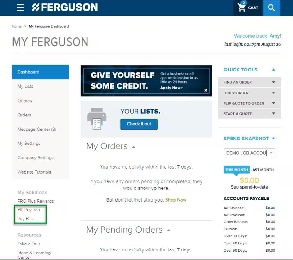 Ferguson commercial credit customers can save time and securely access and pay invoices online 24/7 using Online Bill Pay on ferguson.com.